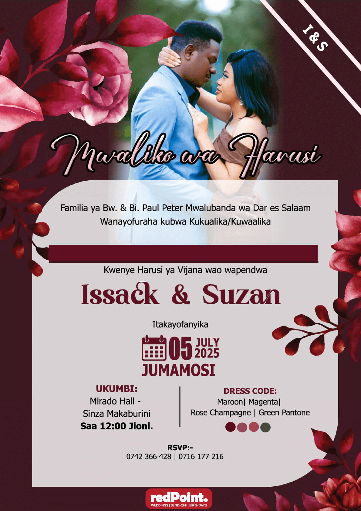 Tunawashukuru Issack na Suzan kwa kutupa nafasi hii, na tunawatakia ndoa yenye baraka, upendo na amani ya kudumu.
